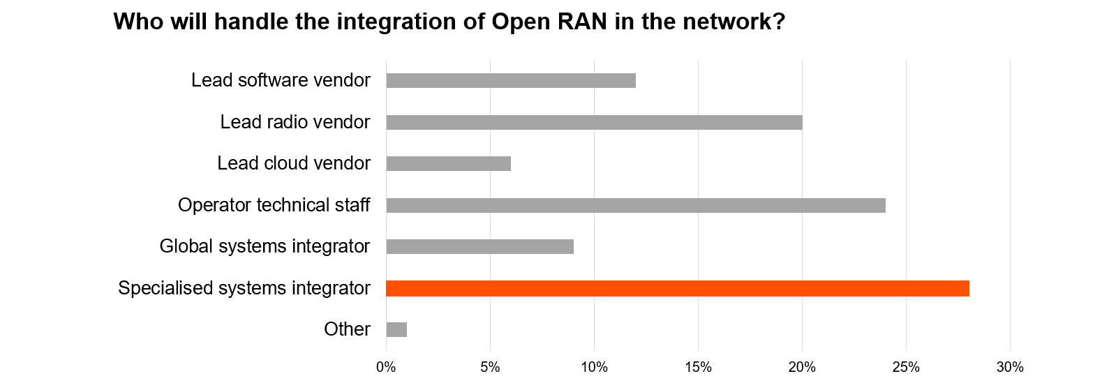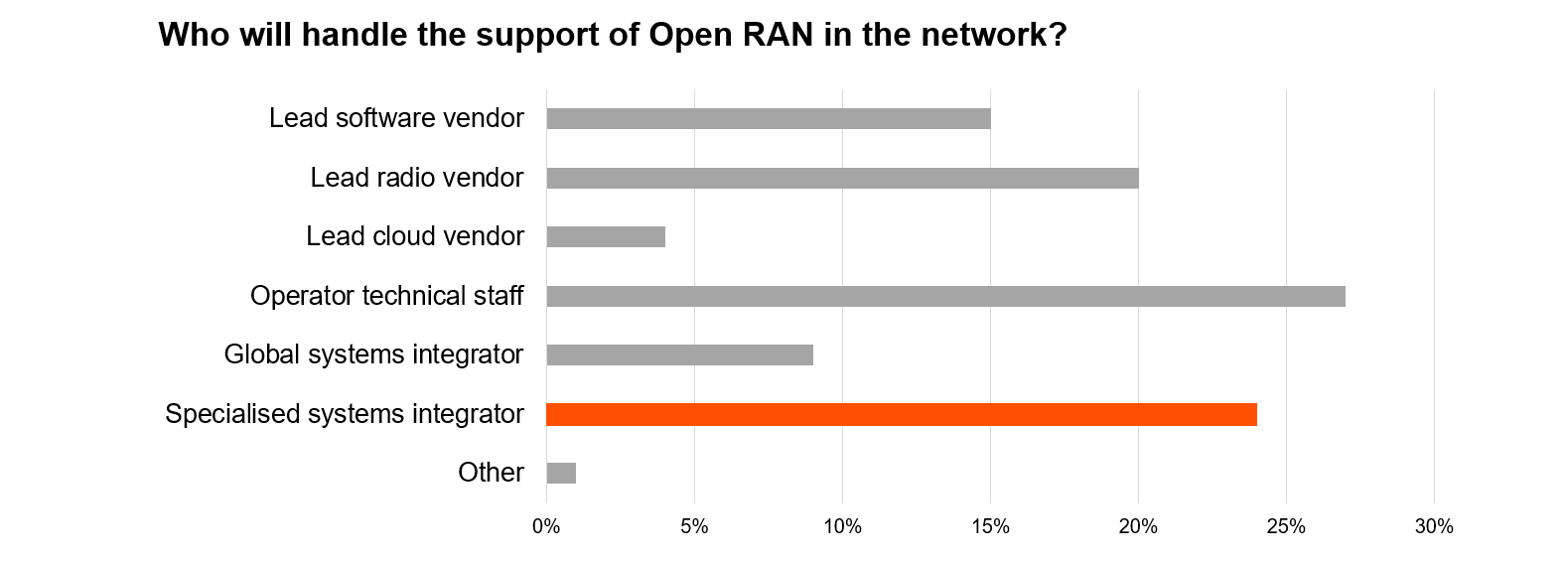 The research also shows the emergence of Open RAN specialized system integrators as necessary to bolster and satisfy the increased complexity of reaggregating the disaggregated, and such companies will play a significant role in years to come. Around one third of participants believe that specialized system integrators will handle both integration and support of Open RAN, thanks to their deep radio and cloud integration skills, whilst global systems integrator and operator technical staff are seen as secondary alternatives.